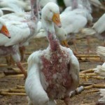 Geese live plucked. Photo courtesy of Animals Australia - The way down is obtained is by a method called ???Live-Plucking???, whereby geese and ducks are held down while having their feathers plucked from the roots. This agonising process can happen up to six times a year, with many animals suffering broken legs, wings and deep wounds which are stitched back with no anaesthetic. Most down comes from China. After the use of the birds for feathers has been achieved, the birds are sent to slaughter.