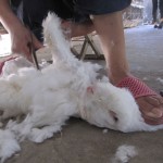 Mulsing. Photo courtesy Animals Australia from the area around the lamb anus without anaesthetic. Most lambs will have their tails cut off and will be castrated at the same time.